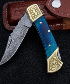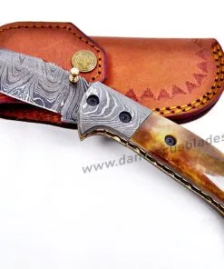 Custom Damascus Steel Folding Pocket Knife with Leather Sheath